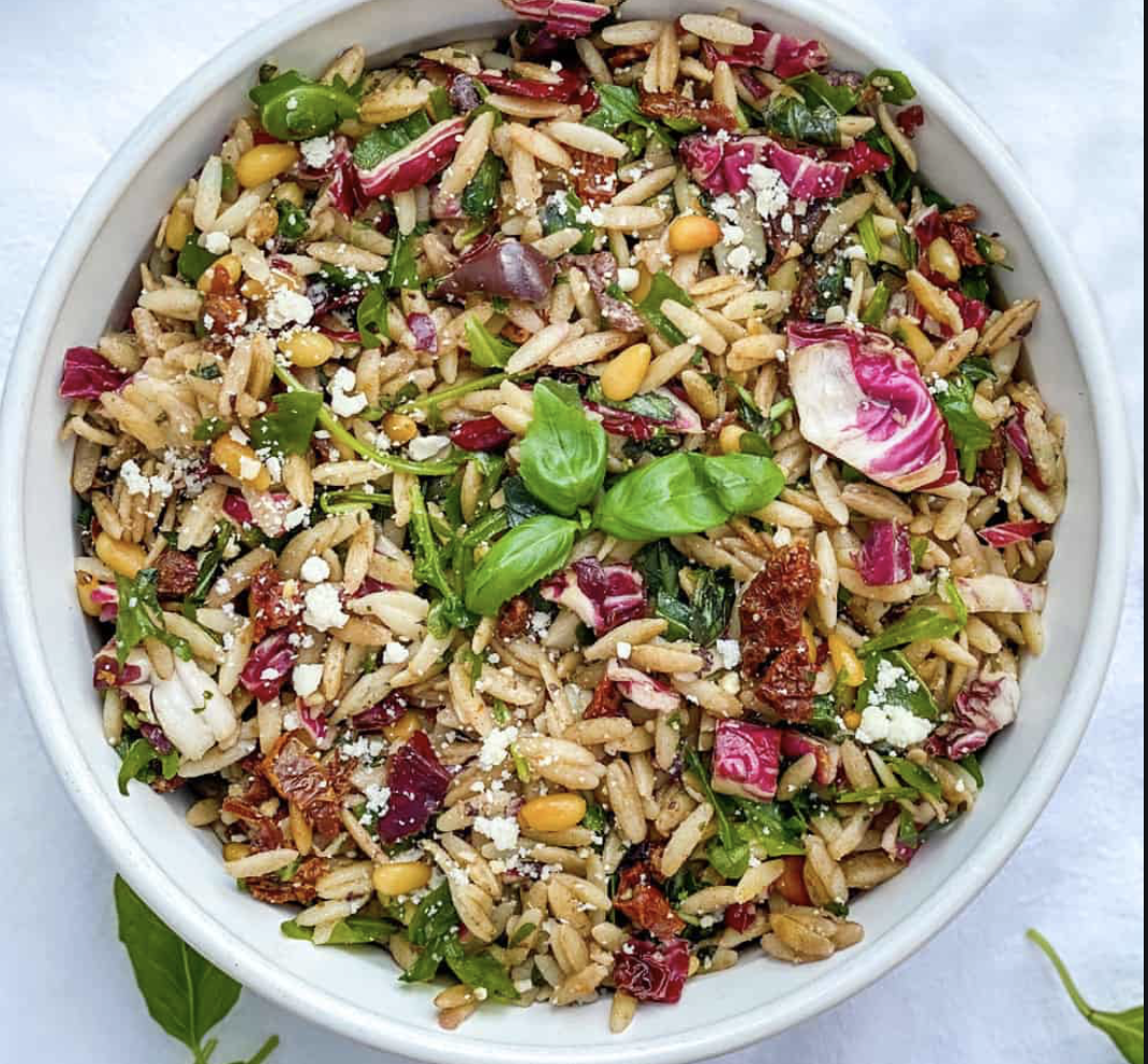 - Mix chopped radicchio, pine nuts, chopped basil, Parmesan and garlic into orzo mixture. Season salad to taste with salt and pepper and serve.