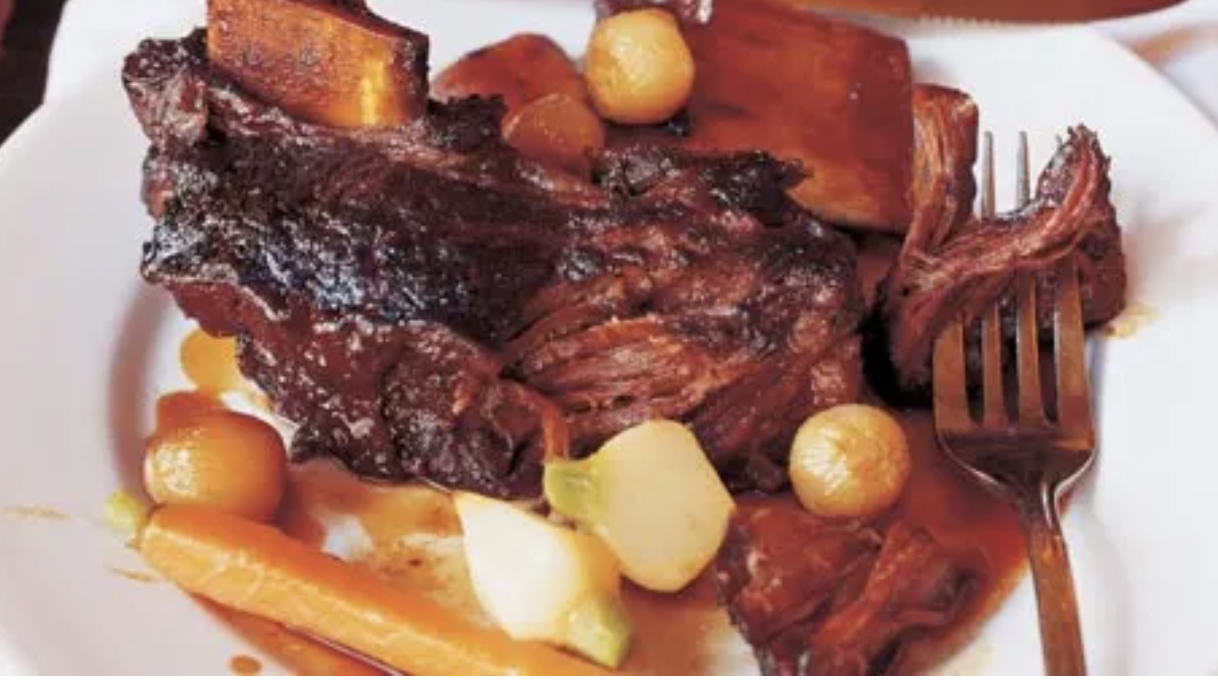 - 1. Heat oven to 375 degrees. Season the ribs with kosher salt and pepper. Heat oil in a large Dutch oven over medium-high heat, and brown short ribs on each side. Remove short ribs, and cook carrots, celery, onions, and shallots until onions and shallots turn golden brown (5 to 10 minutes). Add tomato paste and flour, and cook 2 to 3 minutes.