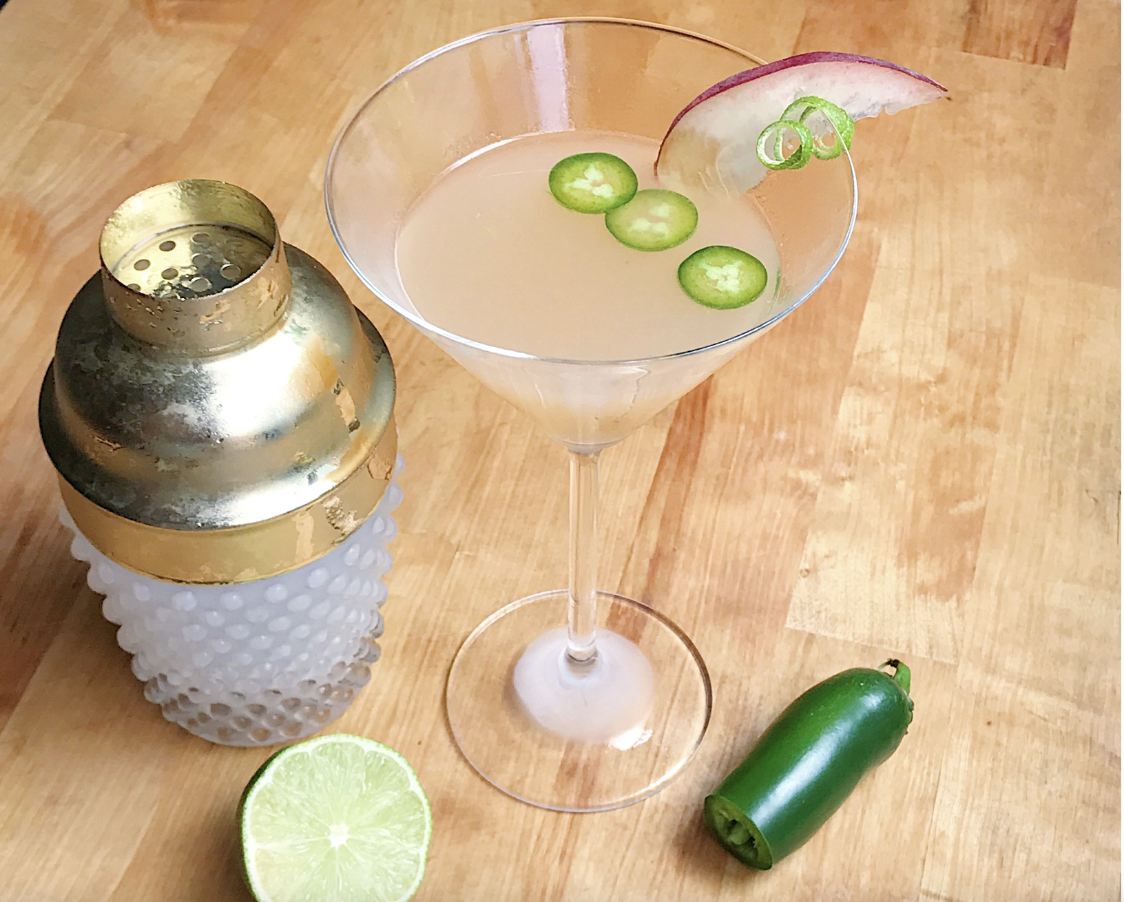 Pour into a frozen martini glass and float one slice of Jalapeno without seeds. Enjoy.