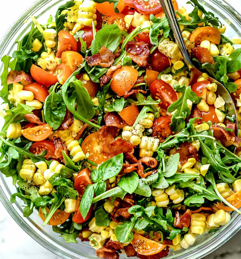 - In a large bowl, toss the corn kernels with the bacon, arugula, cherry tomatoes, and basil. Drizzle with the canola oil and red wine vinegar and season with the salt and pepper. Toss to coat and serve at room temperature or chilled.
