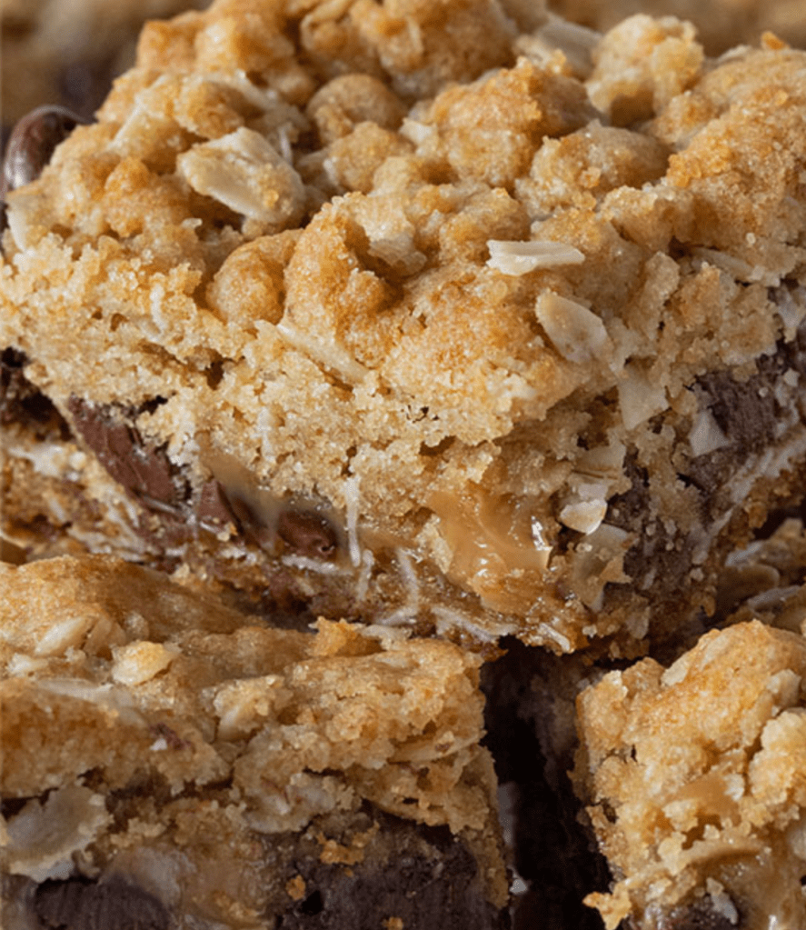 Sprinkle chocolate chips over baked mixture and then pour melted caramel evenly over the chips. Sprinkle remaining oat mixture over caramel and bake for 15 minutes.