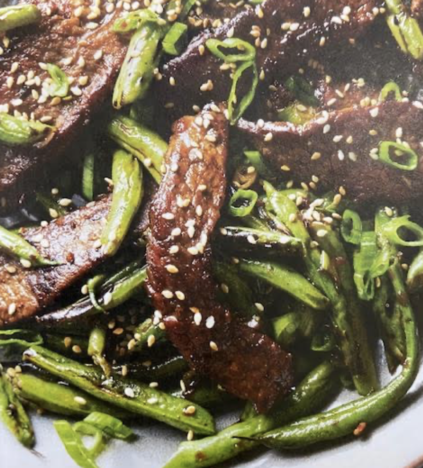 - Return all the beef to the skillet. Stir in the scallions, mirin, sambal oelek, and the soy sauce-sugar mixture. cook and stir for 1 minute. Add the green beans, and cook and stir until beans are heated through, about 2 minutes more. Sprinkle with sesame seeds.