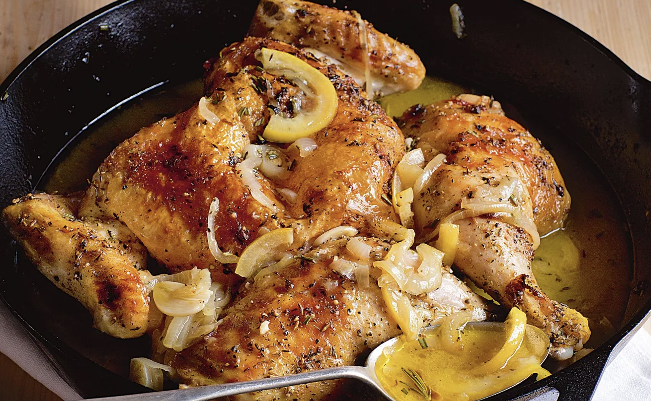 - Distribute the lemon slices in a 12-inch cast-iron skillet and sprinkle the onion and garlic on top. Place the chicken, skin side down, on top of the onion and brush with about half the oil and herb mixture. Turn the chicken skin side up, pat it dry with paper towels (very important!), and brush it all over with the rest of the oil and herb mixture.
