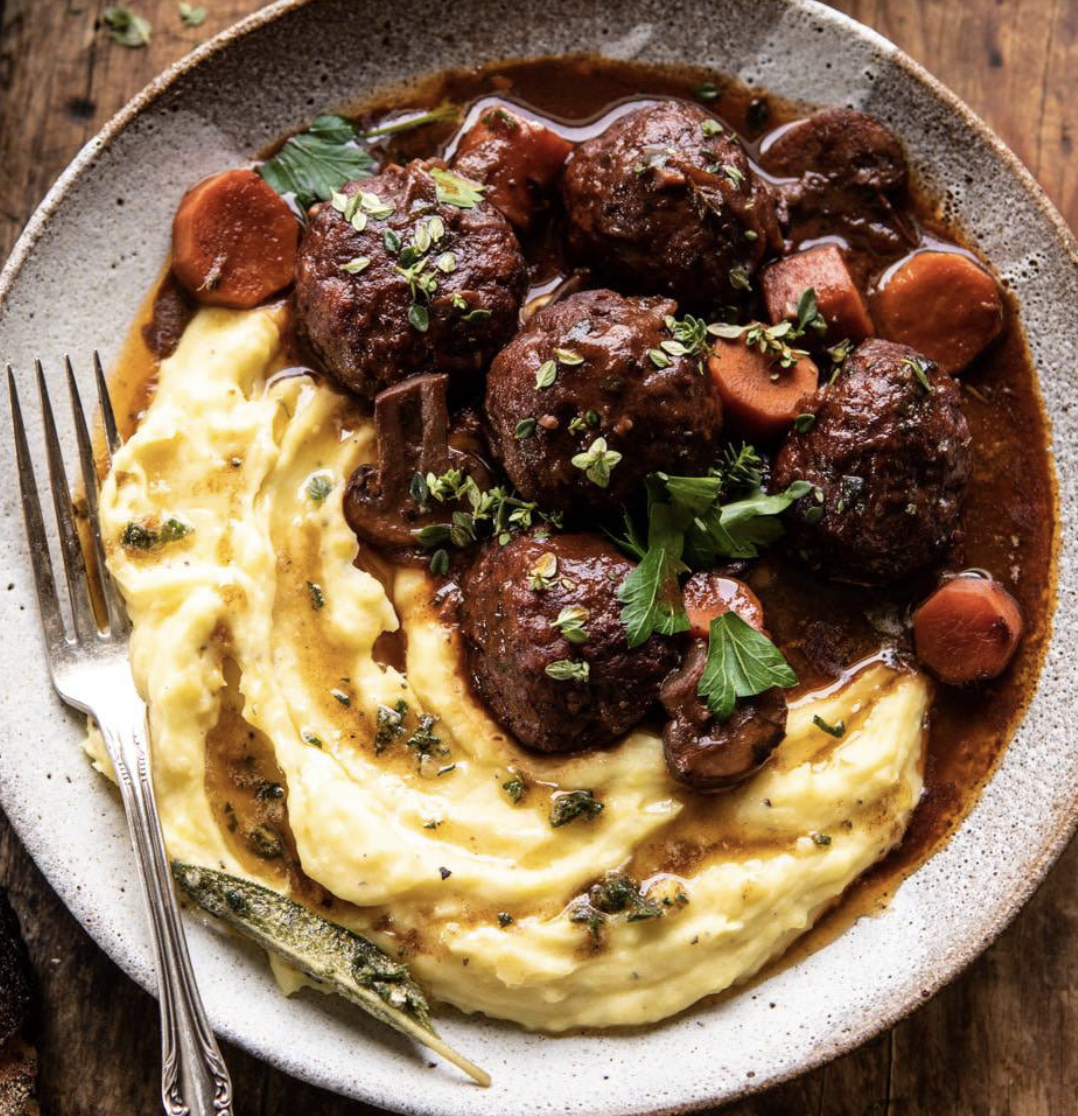 4. Add in the red wine, chicken broth, bay leaves, and thyme. Season with salt and pepper. Stir to combine, bring the sauce to a slow boil, cook 10 minutes or until the sauce thickens slightly. Stir in the meatballs, cover and cook 5 minutes until the meatballs are coated in the sauce. Remove the bay leaves and thyme and discard. Stir in the parsley and reserved bacon. Serve with your favorite mashed potatoes.