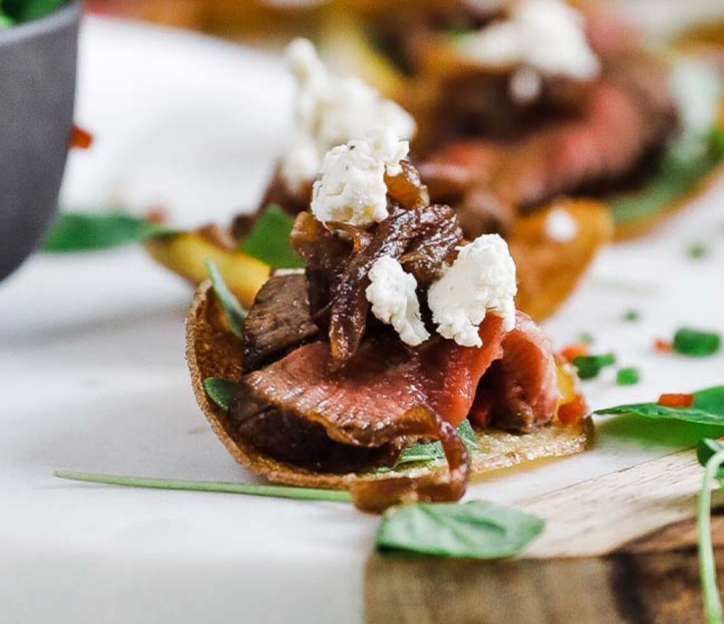 5. To plate: Place few leaves of arugula or some micro greens on the potato chips you made, or a cucumber slice if that’s what you chose. Then layer on some steak, caramelized onion, and a tiny drizzle of balsamic. Top with some Boursin cheese — garnish with some finely sliced green onions or chives. Serve!