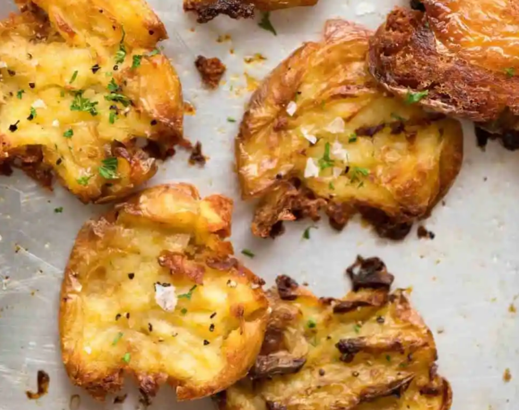 - Preheat the oven to 450 degrees. Brush a baking sheet with olive oil. Put the potatoes on the sheet, and then gently press each with the bottom of a measuring cup or a potato masher until they are slightly crushed. Don’t get carried away! You want each potato to be flattened, but still in one piece.