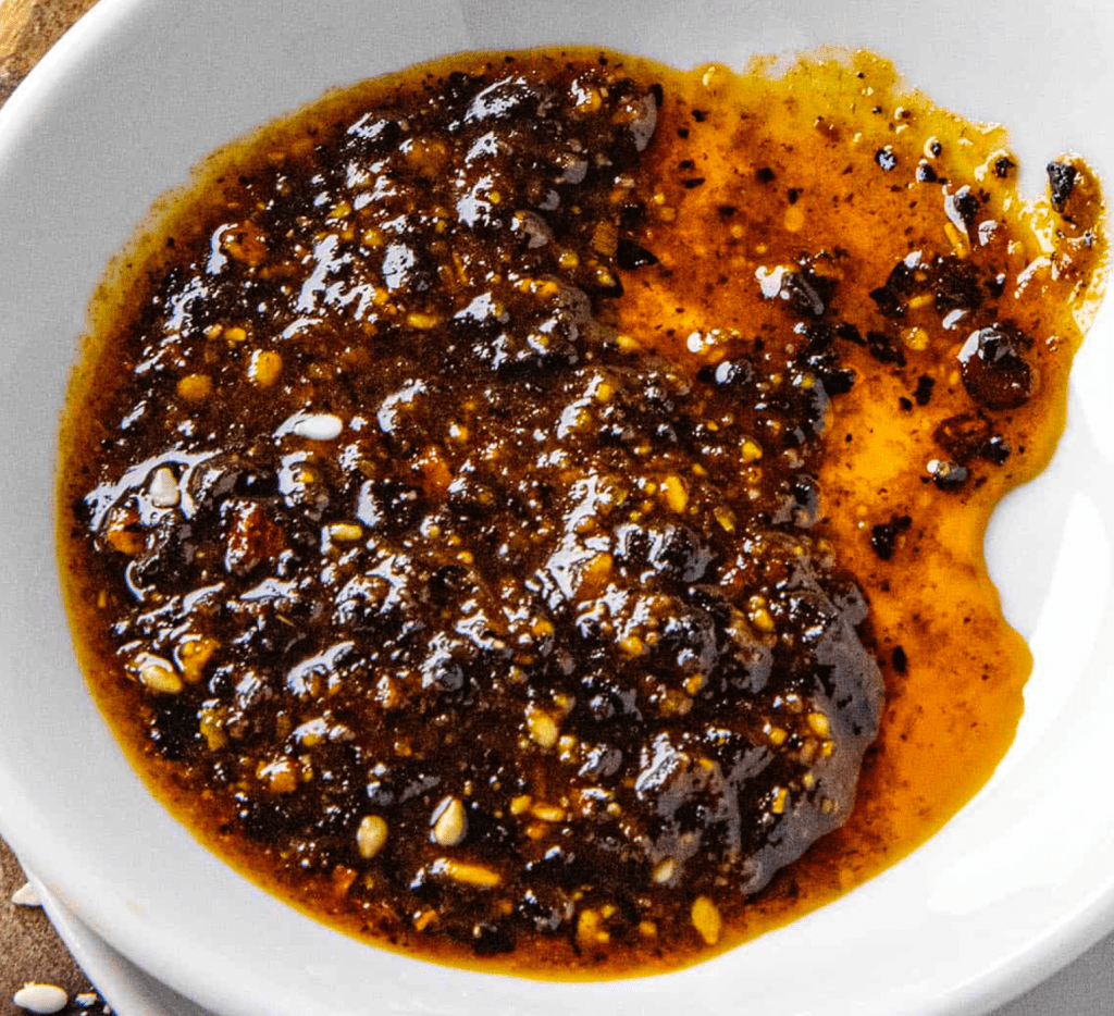 - Set a large heavy skillet over medium heat and add the oil. Once the oil is hot, but not smoking, add the garlic cloves. Stir and fry for about one minute, until they start to gain color. Add the chiles and peanuts, stir and fry for about two minutes. Add the sesame seeds, stir and continue to fry for about a minute. Remove from heat. Carefully transfer all the contents from the skillet into the jar of a blender. Let cool for about 10 minutes.