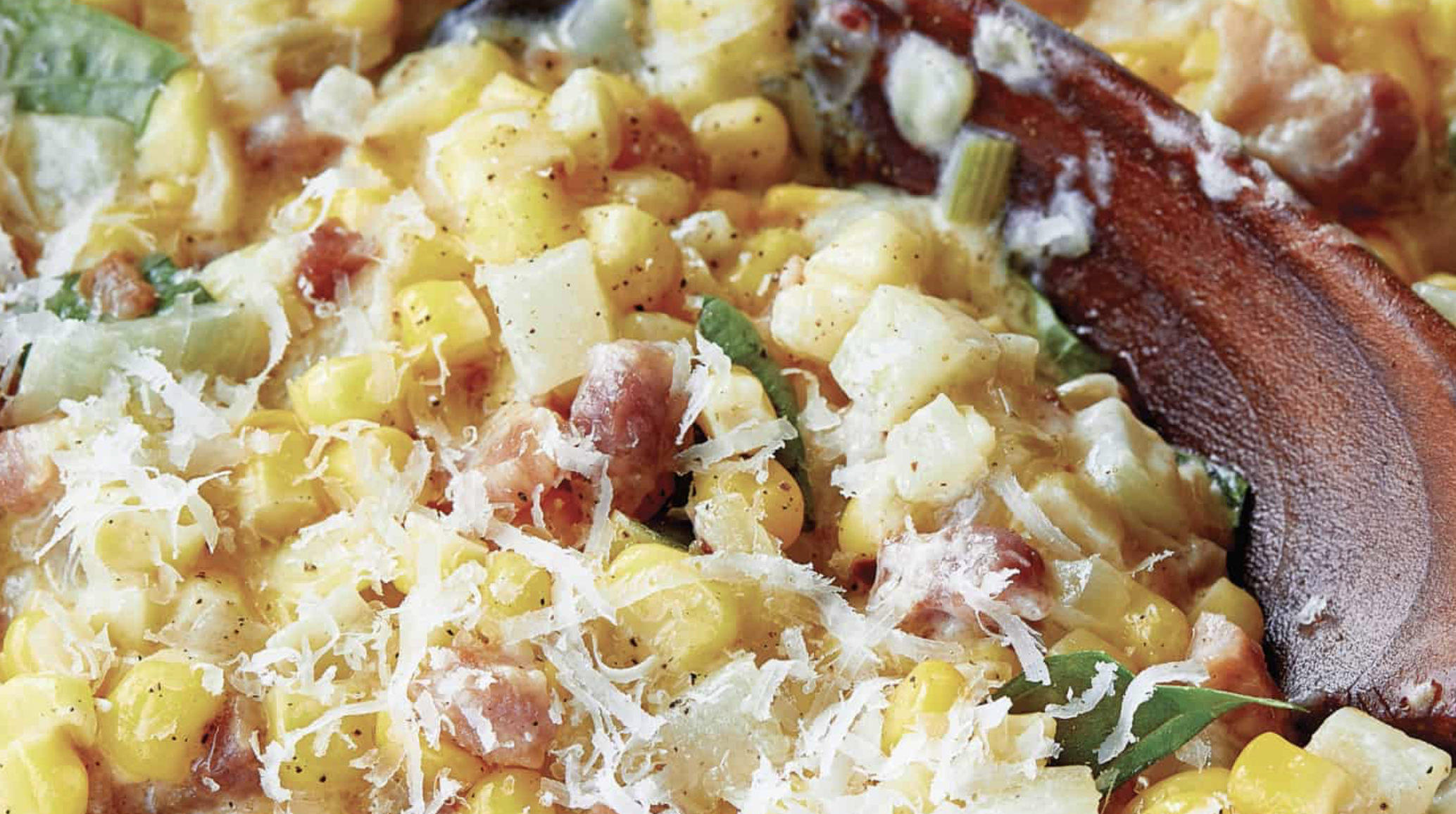 - Turn the heat on to medium, and add another few tablespoons of butter. Swirl the pan until it’s almost melted and add the corn and its juice, stir and warm through. Taste for salt, and if the corn seems dry add a little more liquid. Drain the pasta and then toss with the corn. Sprinkle with freshly grate parm and serve! SO YUMMY!