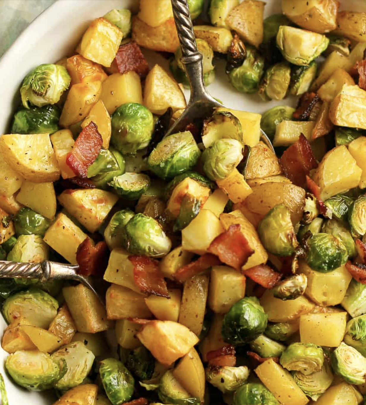 There’s a chain of restaurants called Breakfast Republic–I’ve been to the one in San Diego several times. I’m not fond of breakfast — I really don’t like eggs except in cookies . . . but my friends and family like it, so if I want to hang with them, I have to go to breakfast. At Breakfast Republic, my favorite menu item is their super yummy roasted potatoes with Brussel sprouts and bacon that I usually share with my granddaughters.Since I can’t do a side by side comparison, I have to rely on my vague (and getting vague-er by the day) recollections. This is my latest version.