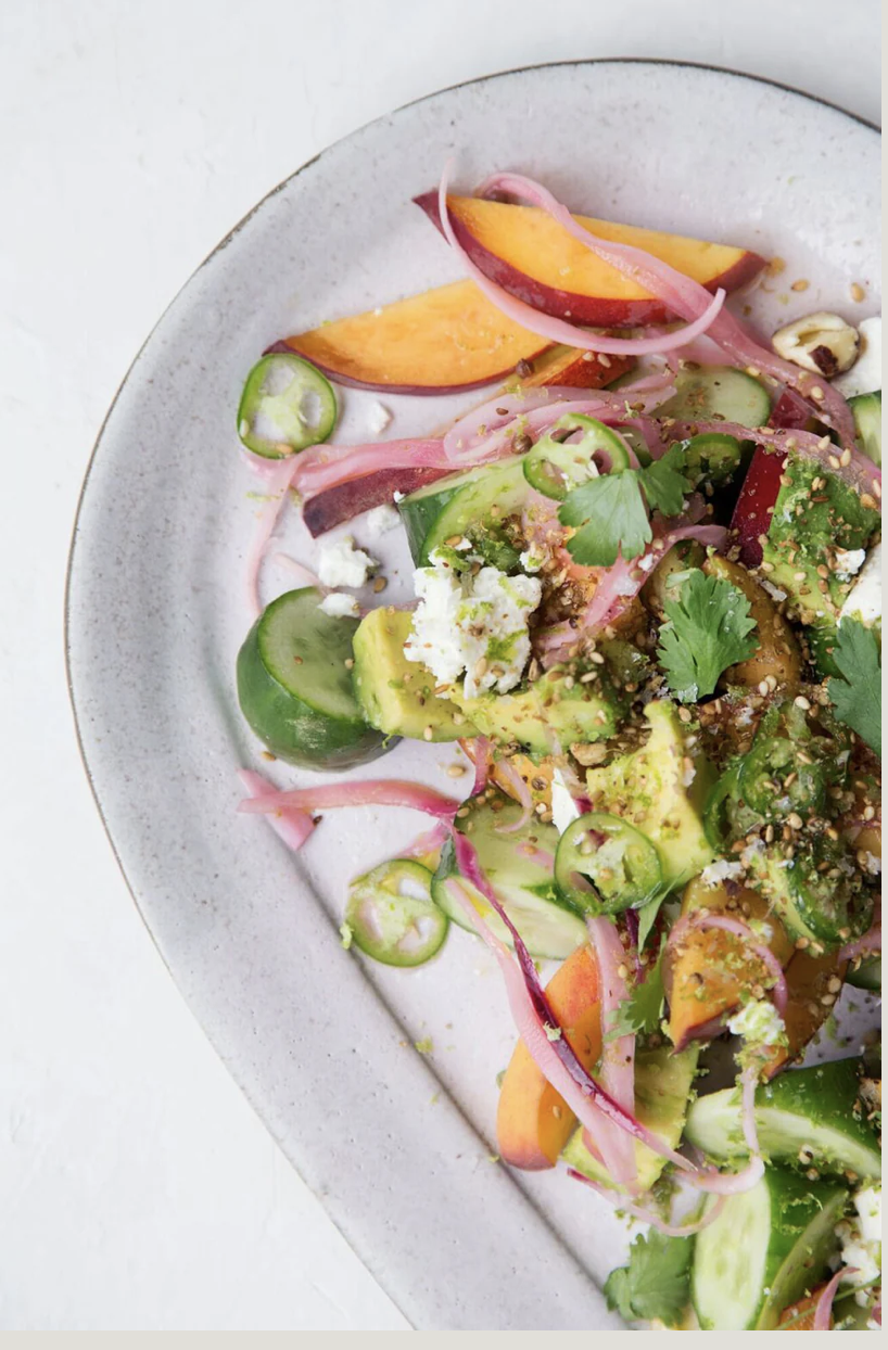 Build this salad on the plate, from the bottom up. Begin with the cucumbers and layer with peach slices, avocado cubes, pickled onions, feta, and chili rounds. Drizzle with olive oil and fresh lime juice. Finish the salad with fresh lime zest, torn herbs, dukkah, salt, and pepper.